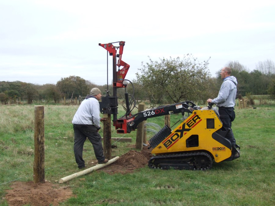 Knocking in fence posts between field and meadow
